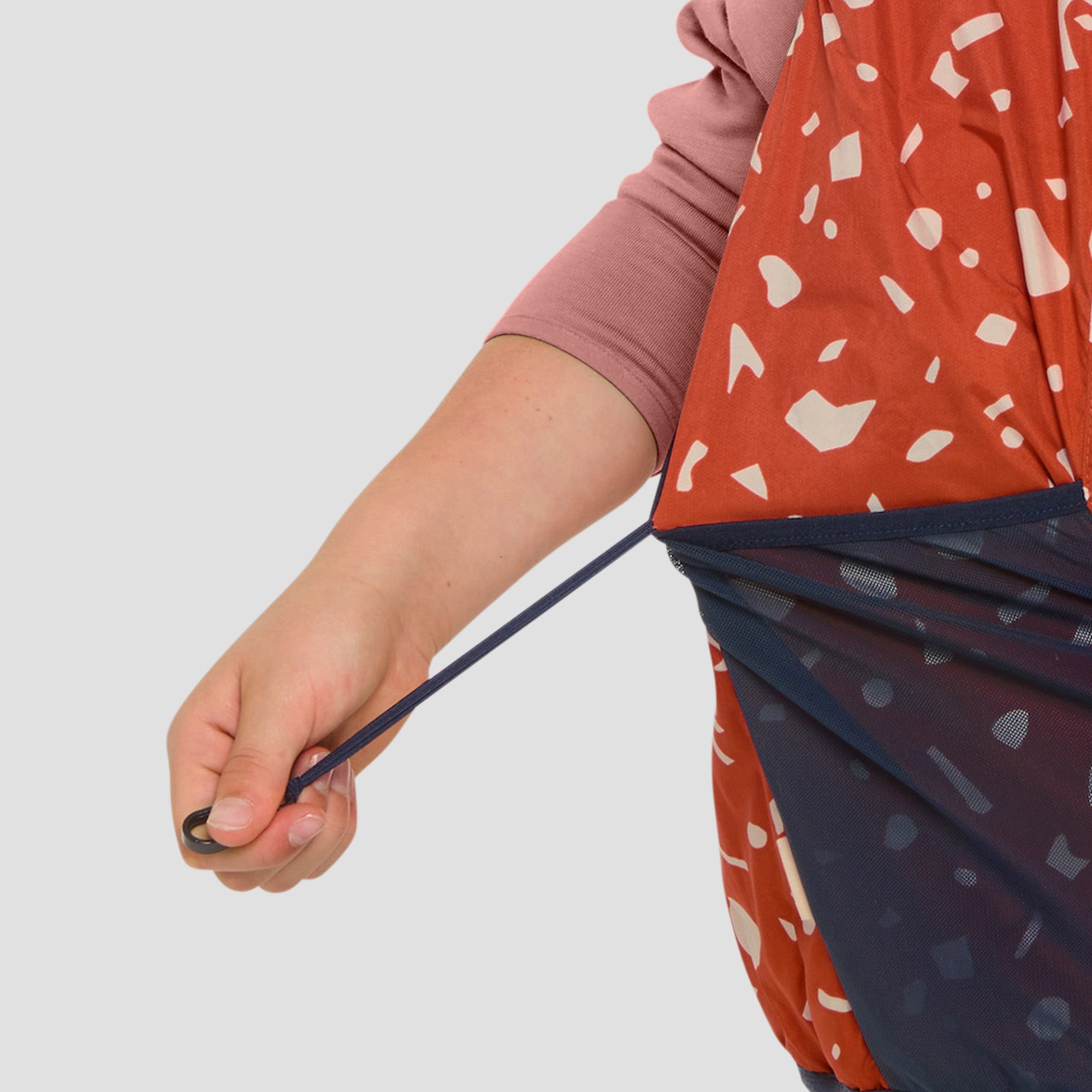 Umgedreht stehen grosse Taschen zur Verfügung, um allerlei zu sammeln und zu verstauen. Schwups wieder gedreht, verschwinden alle Schätze vor neugierigen Blicken. Mit einer kleinen Kordel und einem integrierten Geheimfach bleiben auch die kleinsten und wertvollsten Sachen an ihrem Ort.
