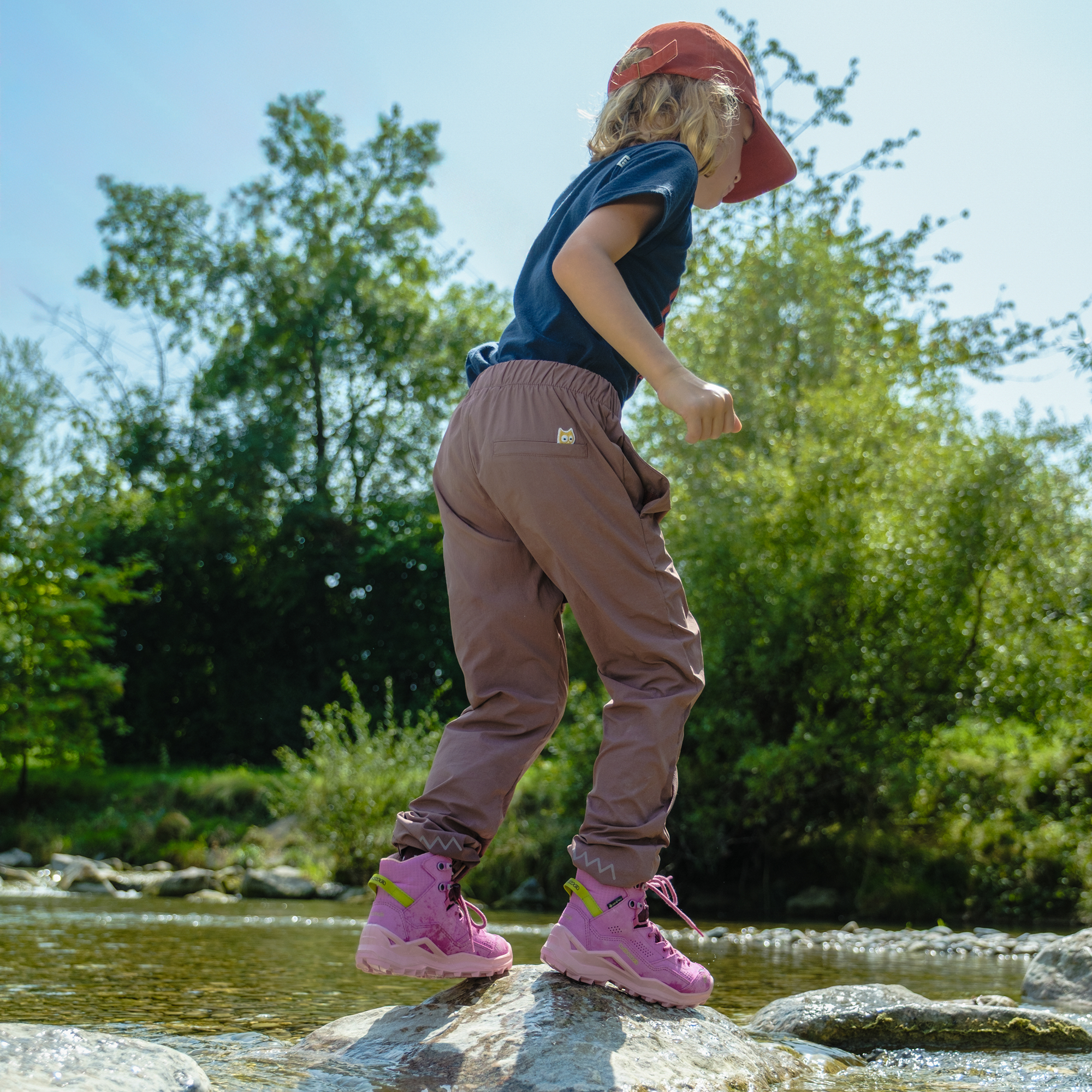 Auch wenn es warm ist, braucht man lange Hosen: Kids, die gern durchs Unterholz streifen, können ein Liedchen singen von fiesen Kratzern. Phos besteht aus einem ultraleichten und doch widerstandsfähigen Material (94 % Econyl, plus 6 % Spandex), das genauso bewegungsfreudig ist wie die Träger*innen und schnell trocknet.