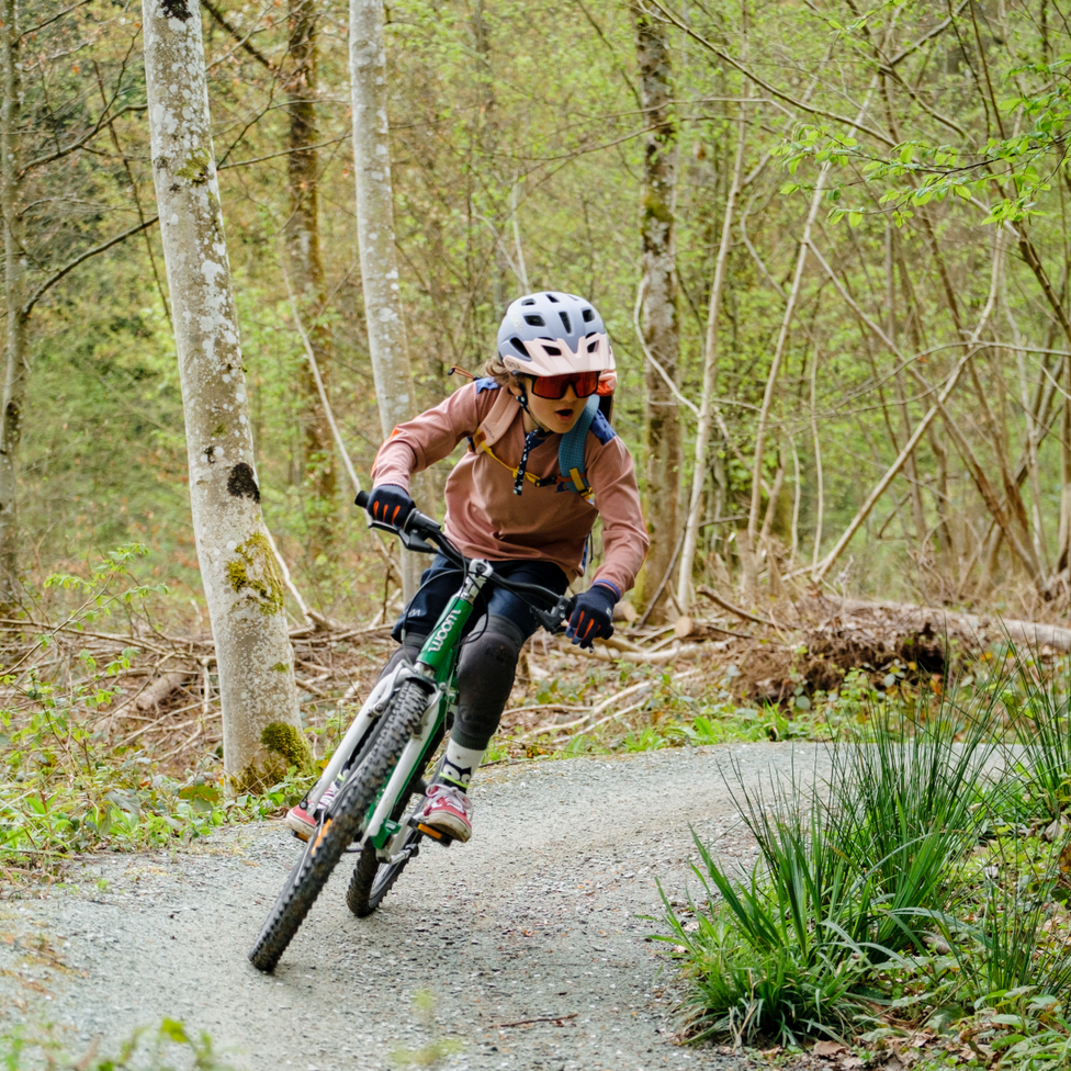 Safety first: The most important gear when getting on a bike is a helmet. A crash can happen quickly if a child doesn’t see a tree root or stone. With our brightly colored helmets, equipped with the best technology from Giro, little heads are securely protected.Our durable and breathable shirts and pants guarantee maximum freedom of movement. The padded bike underwear protects kids from uncomfortable pressure sores from the saddle on longer bike rides. In bike shirts made from high-quality Merino wool, sweat is wicked away from the skin and your kids don’t feel chilly when they take a break. If rain clouds start to hover, just grab the light One Ultralight rain jacket from the backpack and keep biking.